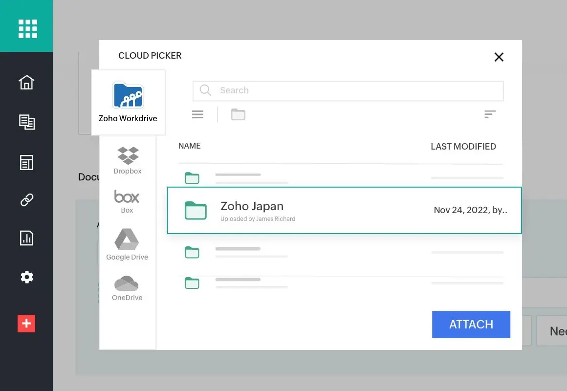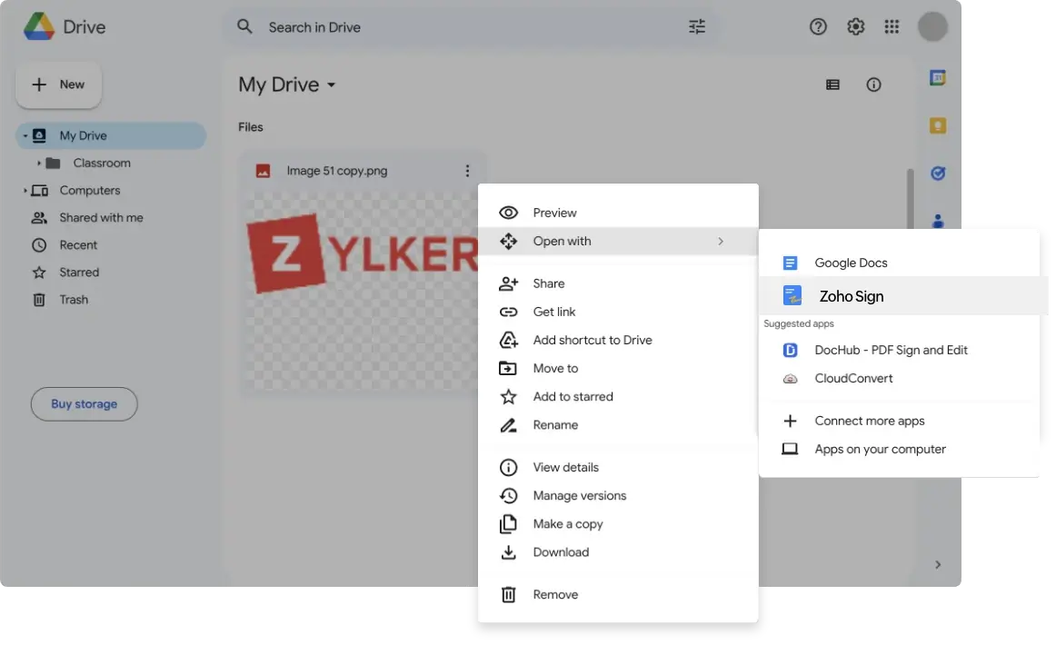 Cloud Import for Zoho Sign Import documents. Add documents from your favorite apps. Zoho Sign’s integration with cloud content collaboration services allows users to effortlessly import any document from top platforms. Start a Free Trial - No Payment Info Required Signing made easy Connect with your content cloudImport documents from popular cloud solutions, such as Zoho WorkDrive, DropBox, Box, OneDrive, and Google Drive. Draft business paperwork Edit your imported documentEdit documents you have imported from Zoho WorkDrive using the Zoho Writer editor, and sync the edited document back to Zoho WorkDrive. Sign from your content cloud Get documents signed fasterRight click on any document in your favorite app and send it out for signature in just a few clicks. Learn more about Zoho Apps Add-Ons Knowledgebase Partner Support Videos Zoho Sign Start a Free Trial Pricing