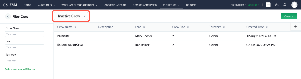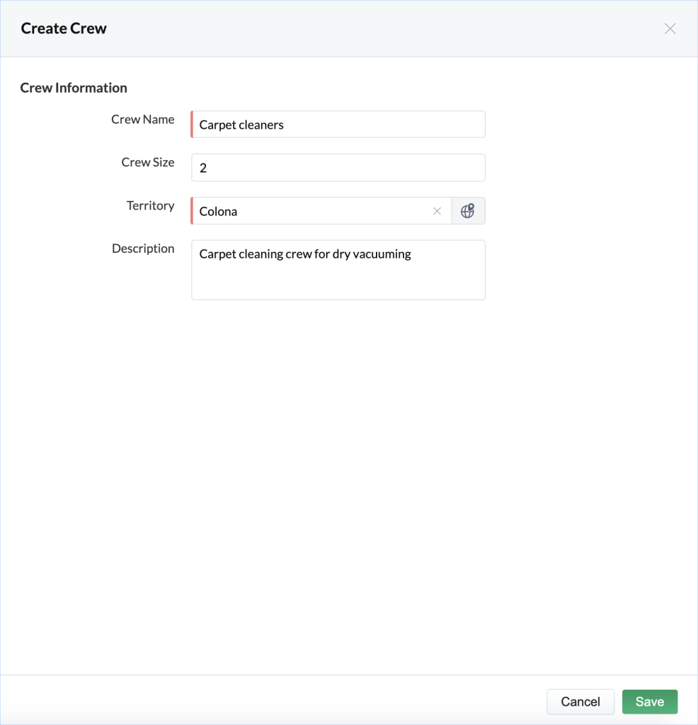 • The number of active field agents in the crew must not exceed the Crew size. Field agents are active in a crew if their End Date is not in the past.