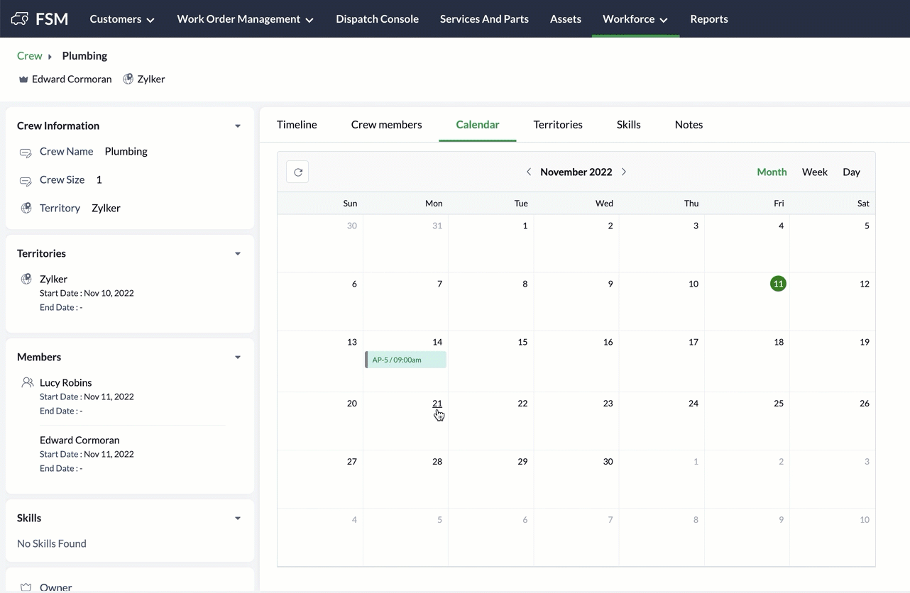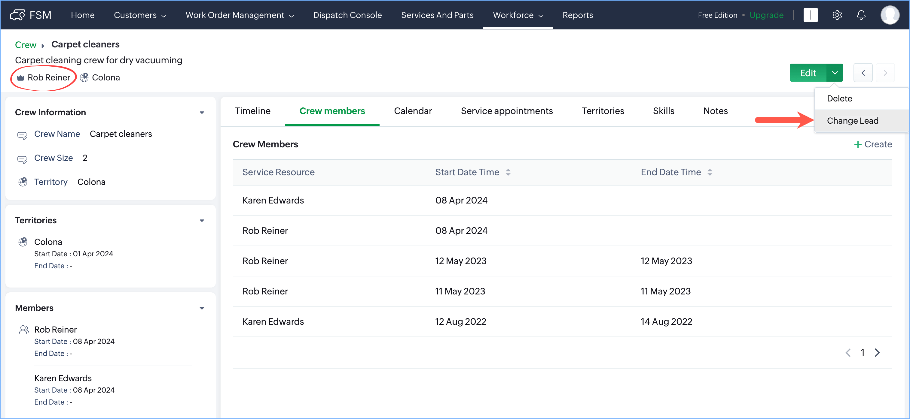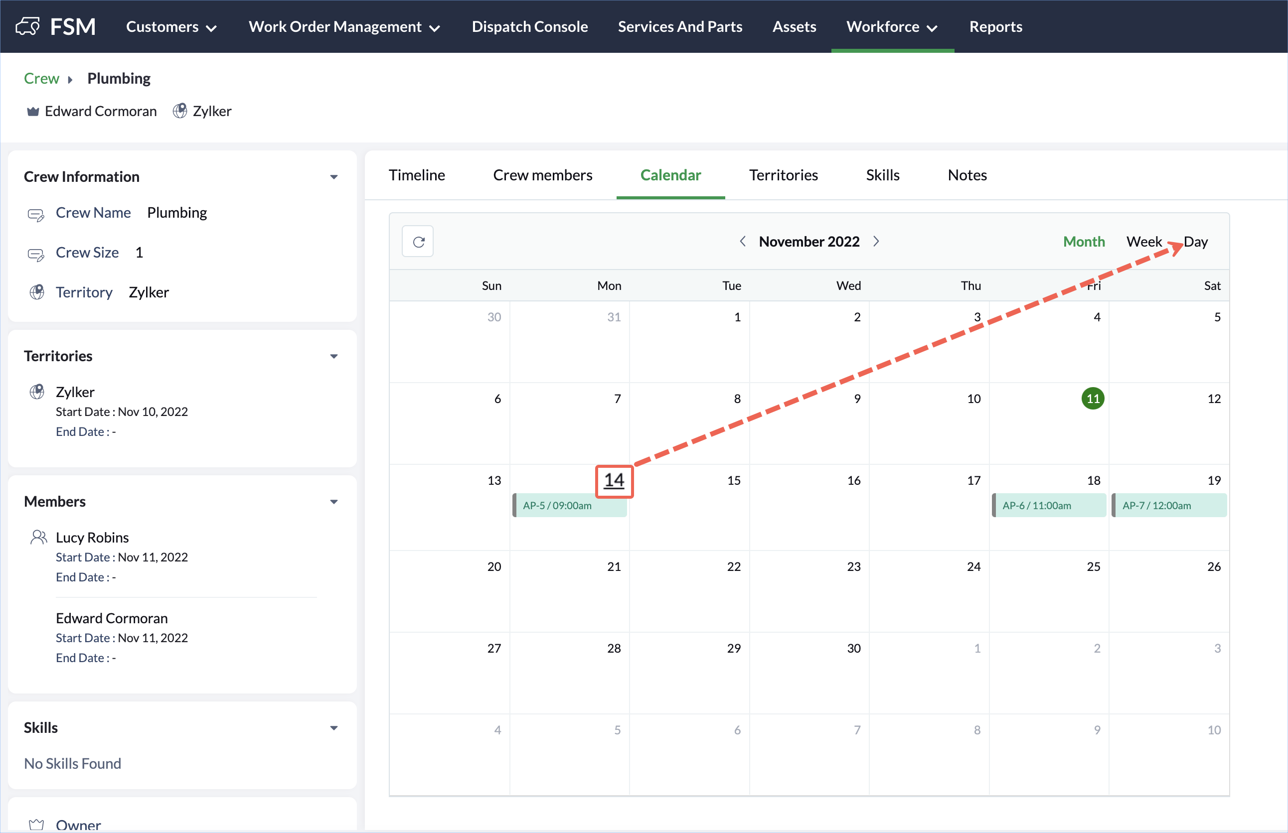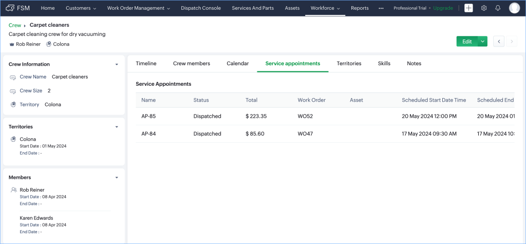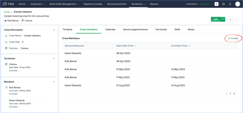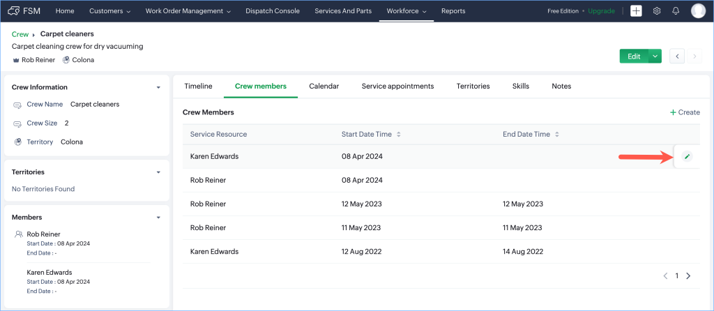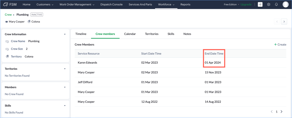 • After you dispatch a service appointment, if you add a member to the crew to which the service appointment is assigned, the service appointment will not be available to this new member unless you reschedule and save the appointment. Please note that the service appointment date should be within the active period (Start Date – End Date) of the new member.