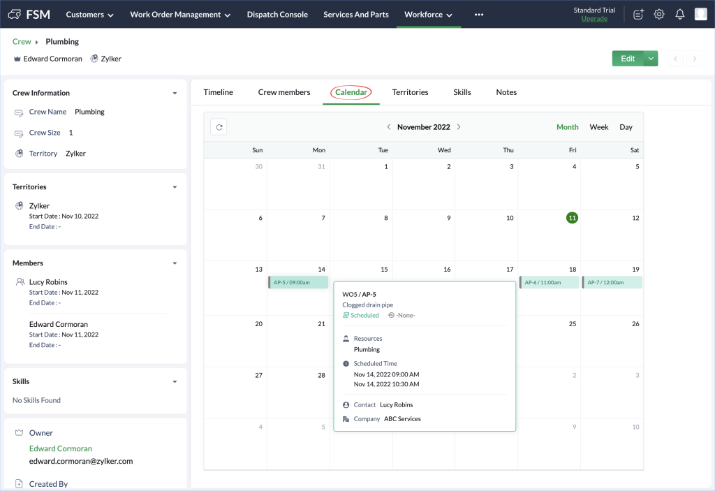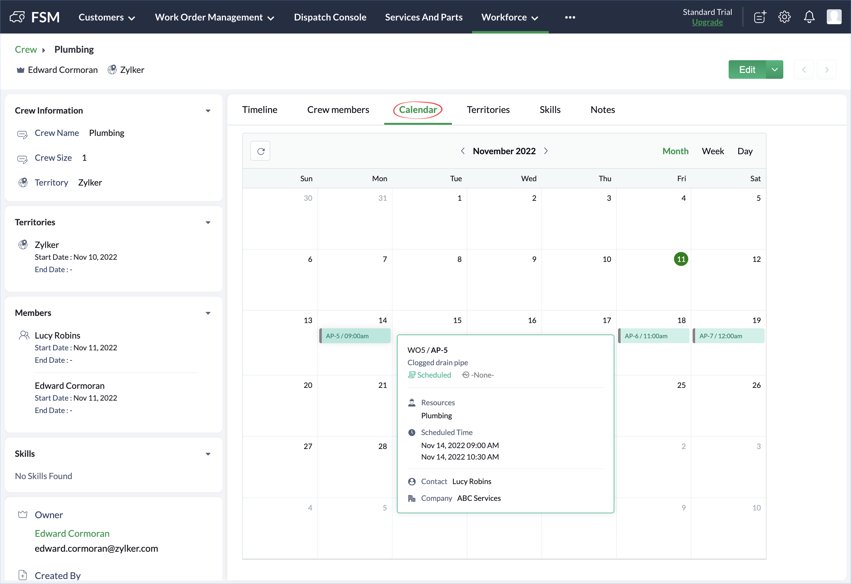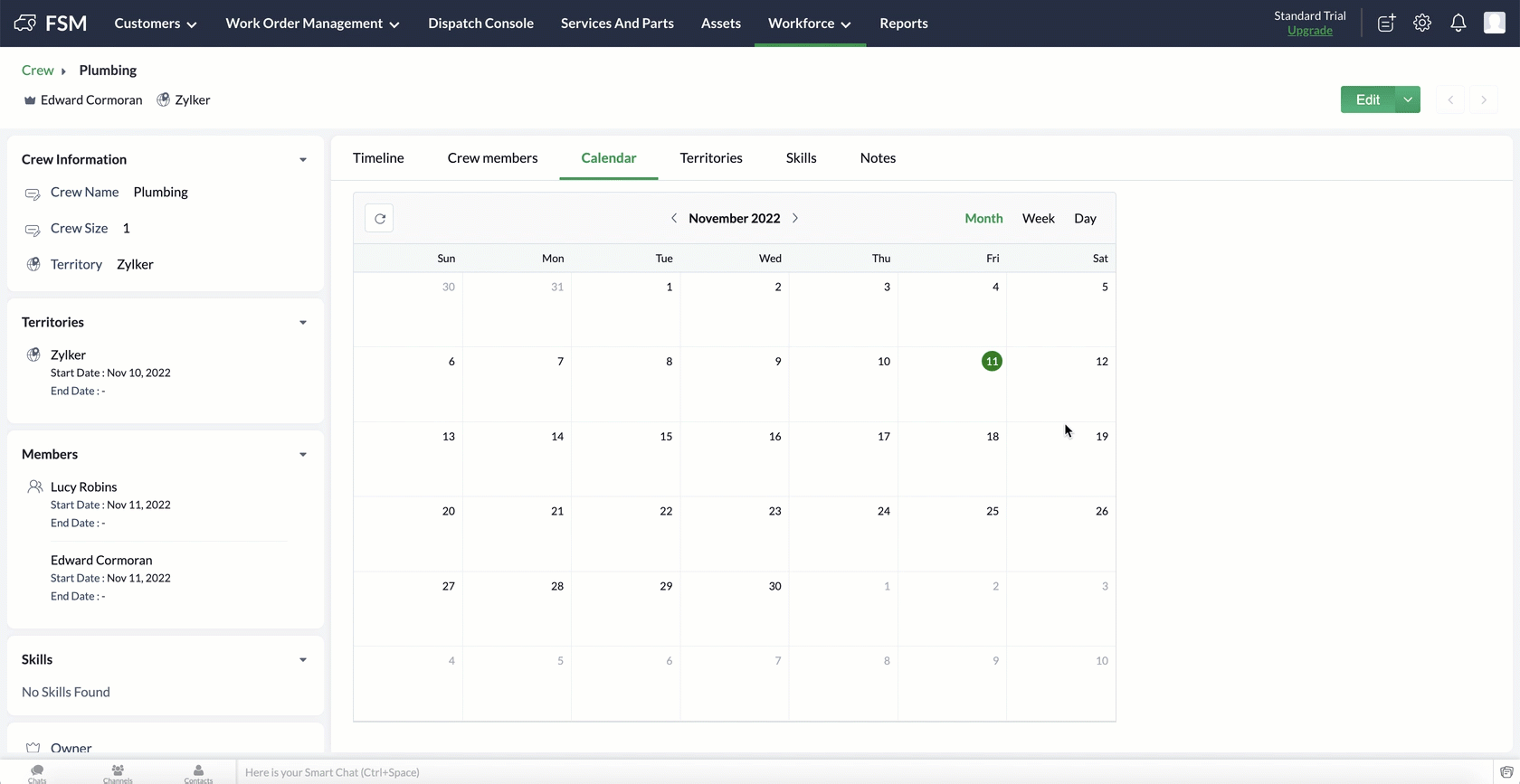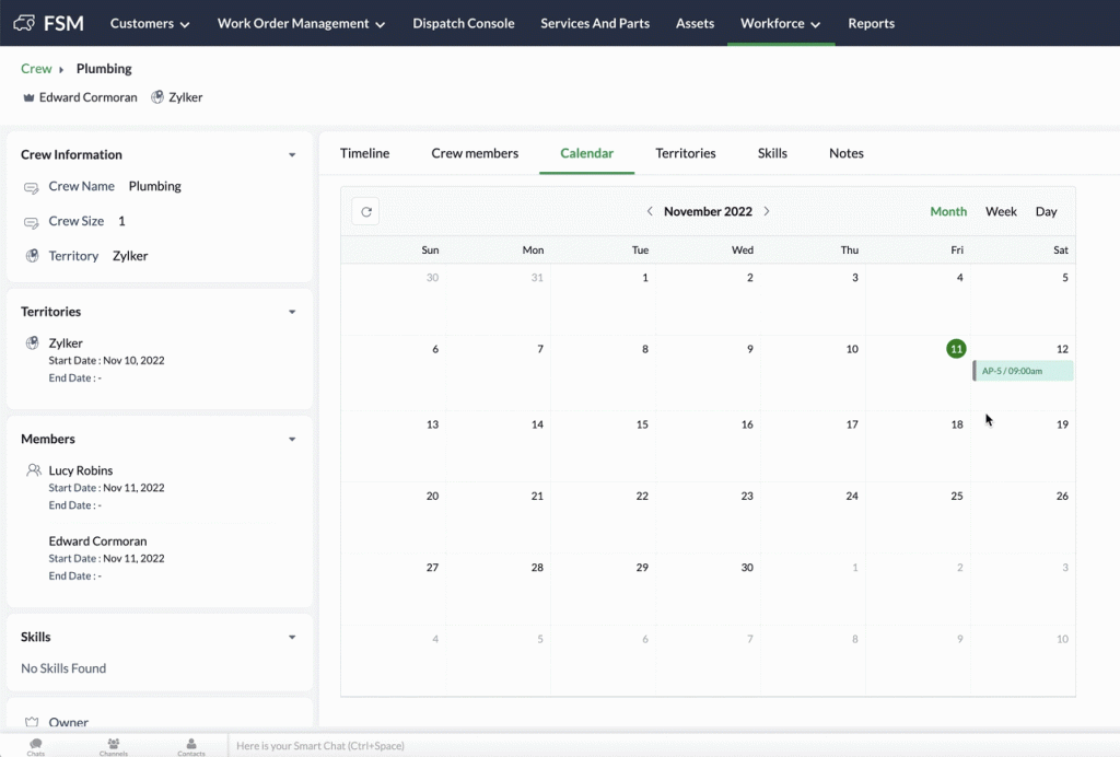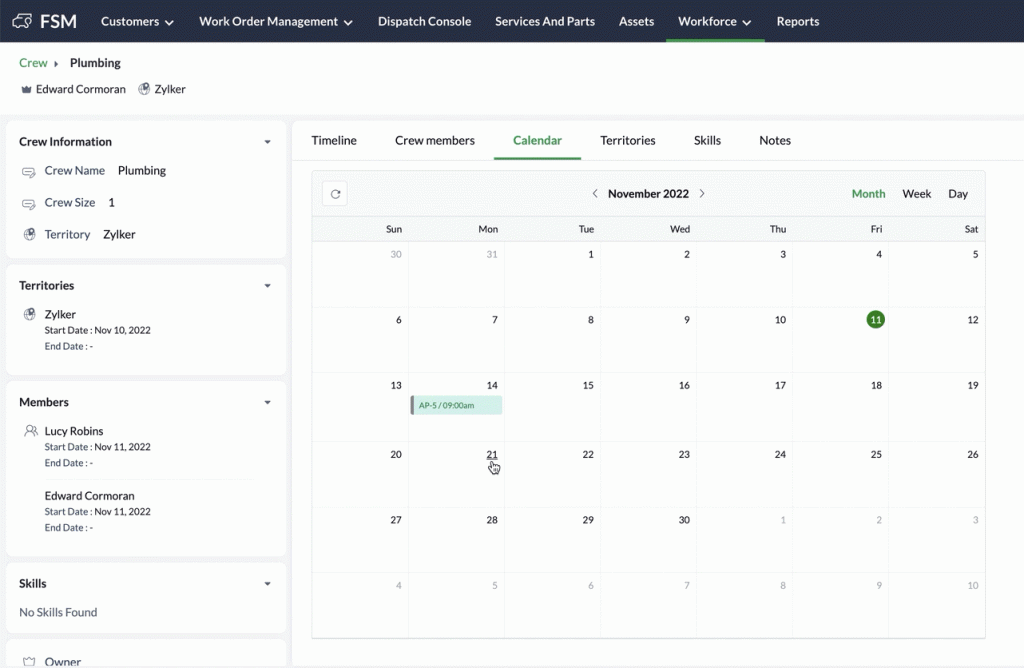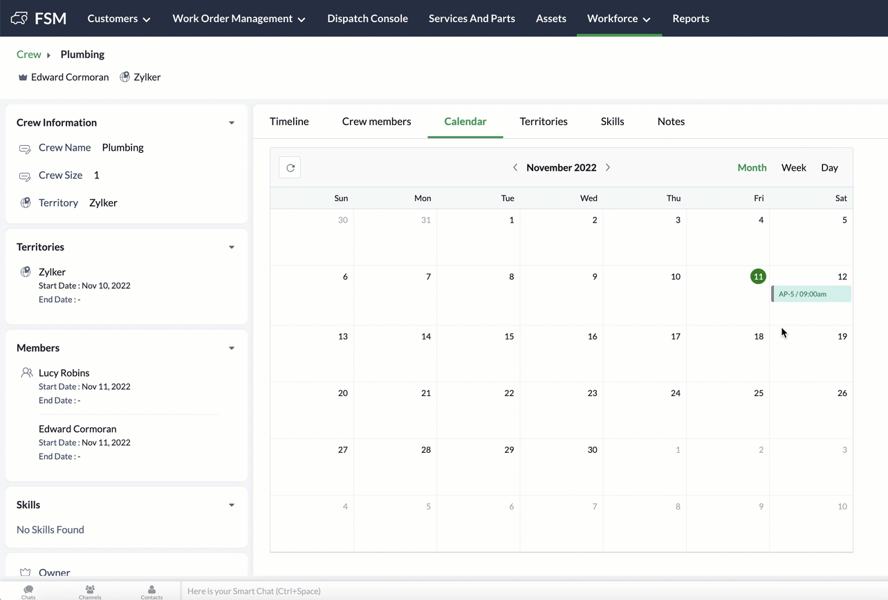 • After you dispatch a service appointment, if you add a member to the crew to which the service appointment is assigned, the service appointment will not be available to this new member unless you reschedule and save the appointment. Please note that the service appointment date should be within the active period (Start Date – End Date) of the new member.