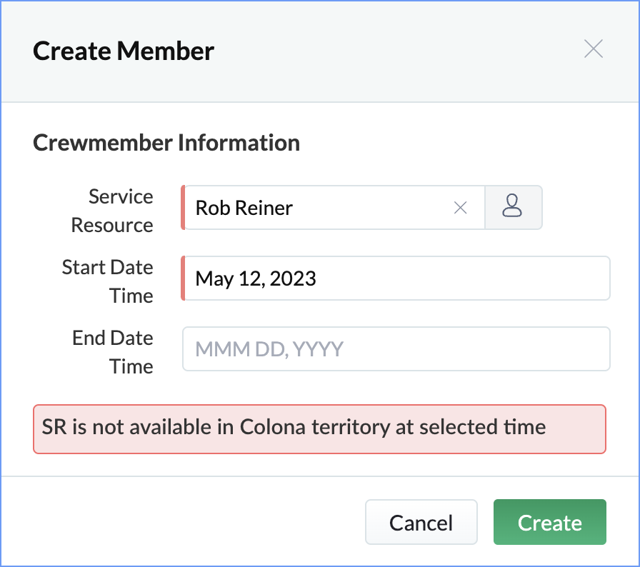 While adding a crew member, if you provide a Start/End Date Time during which the service resource is not present in the selected territory, then you will encounter an error (refer screenshot below). You can either change the Start/End Date Time here or change the Start/End Date Time during which the service resource is present in the territory.
