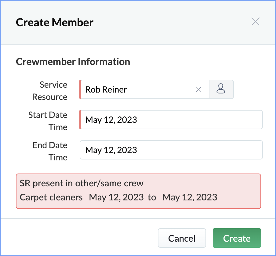 While adding a crew member, if you provide a Start/End Date Time during which the service resource is part of another/same crew, then you will encounter an error (refer screenshot below). You can either change the Start/End Date Time here or change the Start/End Date Time during which the service resource is present in the other/same crew.