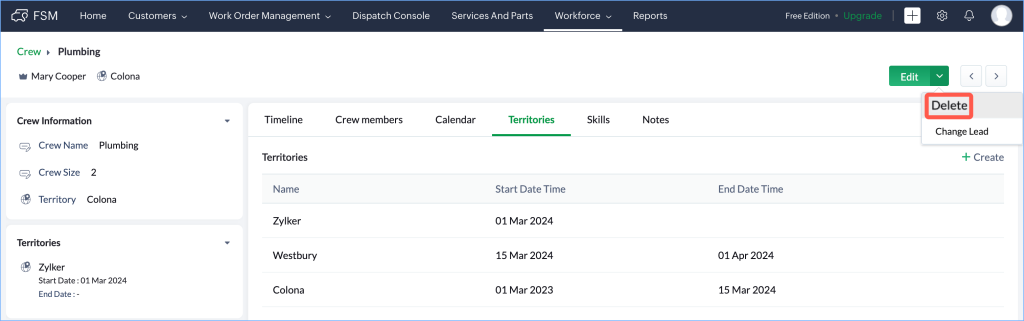 The members and territories assigned to the crew will be removed from the crew. For the active members and the territories, the date of deletion will be set as the End Date Time.