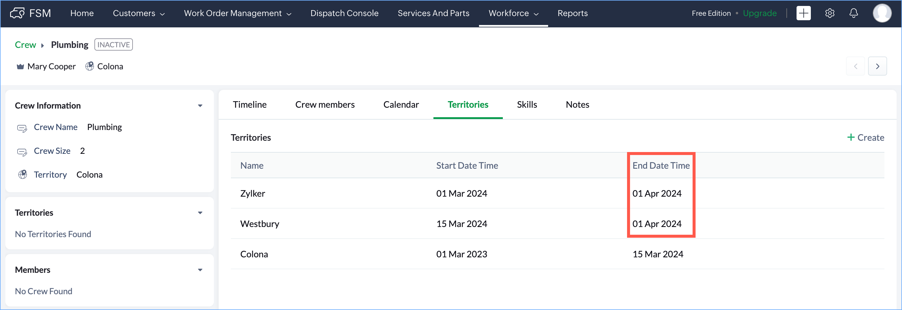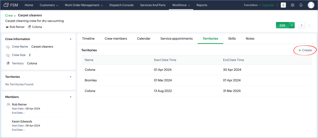 5. Click + Create under the Territories tab to assign territories to the crew. Select a                    Territory, and set the Start Date Time and the End Date Time. The period between the            Start Date and the End Date is when the crew will be active in that territory. Click                    Create.