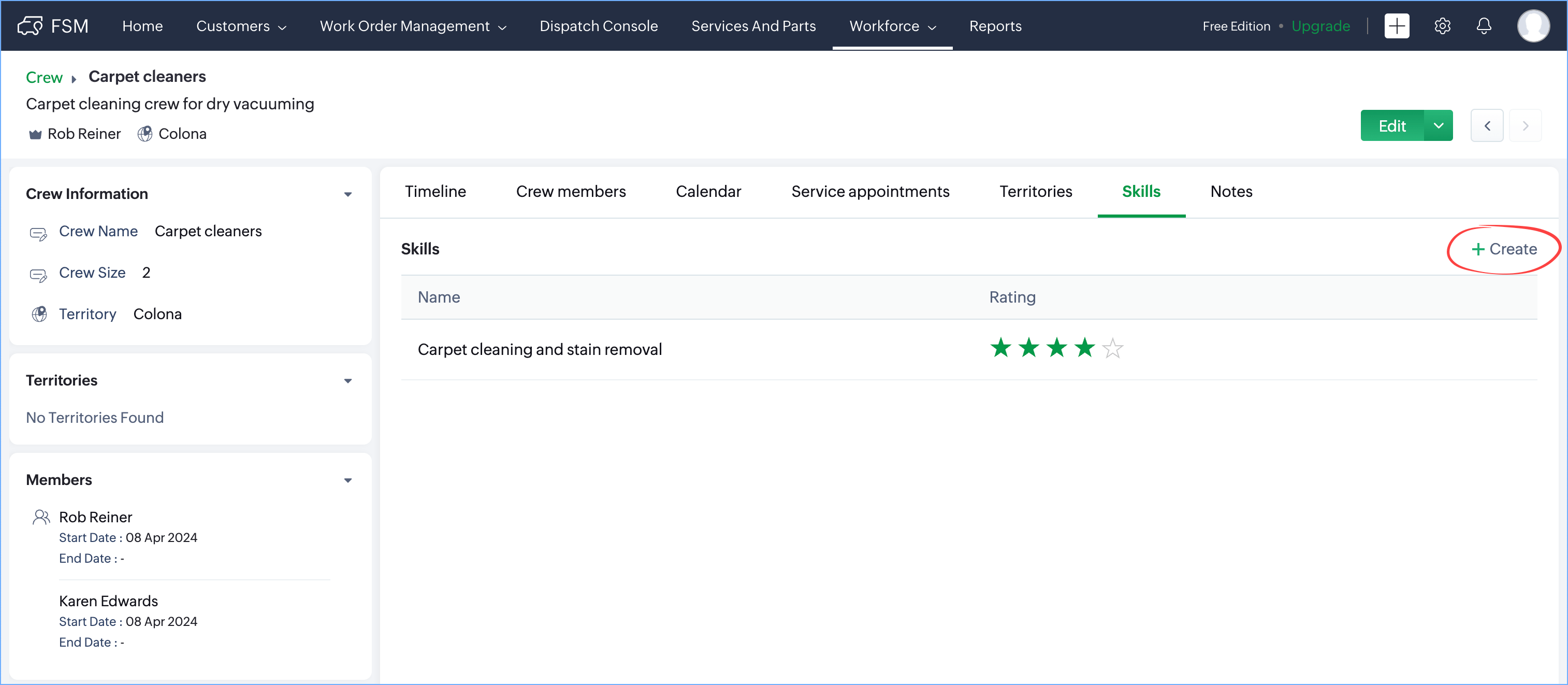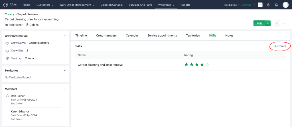 6. Click + Create under the Skills tab to add skills for the crew. Select a Skill and                          Rating. Click Create.