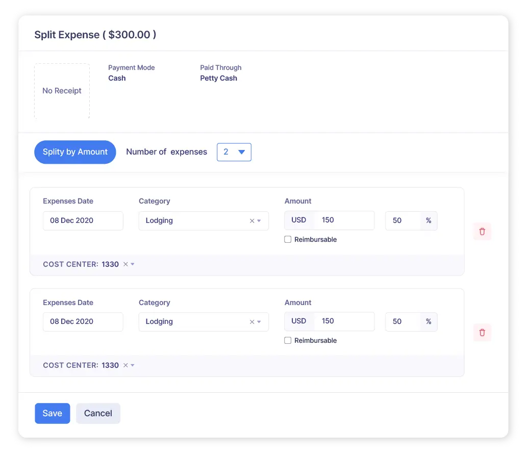 If your organization offers employees an allowance per day, Zoho Expense has got you covered. Set up per diem rates based on location and split them based on expense types.
