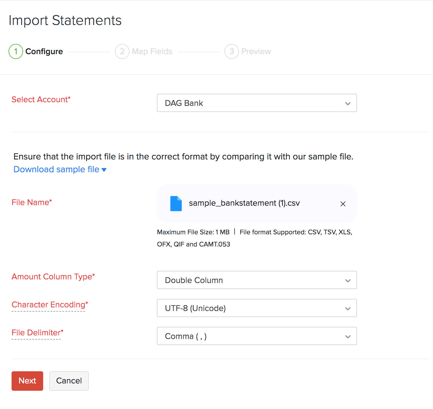 If the chosen file is of the CSV, PDF, XLS, TSV, OFX, QIF, CAMT.053 formats, you will be redirected to the Import Statements page in the Banking module. Here’s how you can add them to your bank.
