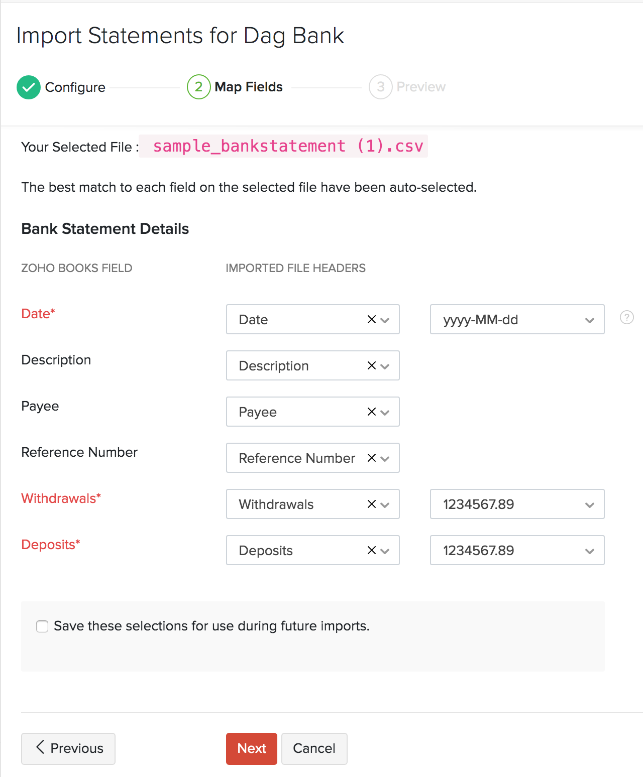 The next step is to map the Imported file headers with the fields in Zoho Books. The best match to each field for the selected file will be auto-selected.