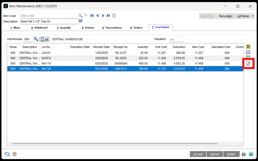 How to Change the Serial or Lot Expiration Date in Sage 100 Go to the Sage 100 Inventory Management Module / Main / Item MaintenanceSelect the Item CodeClick on the Cost Detail TabSelect the LOT or Serial NumberClick on Change LOT/Serial Expiration Date Button 6. In the Change Lot/Serial Expiration Date window, enter the new expiration date. Sage 100 Request Support
