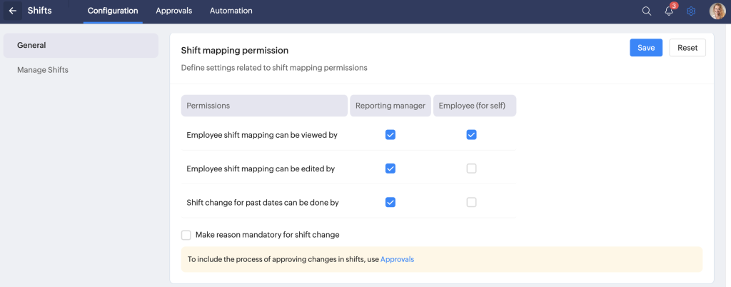 - You also have a shortcut to configuring an approval process for shift changes.