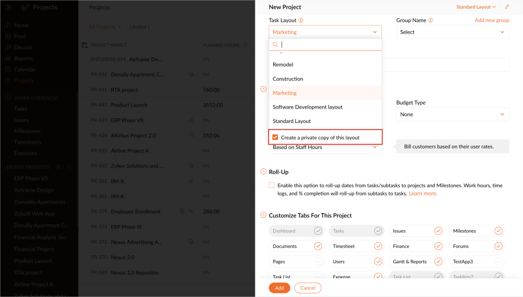How to Create a Private Copy of an Existing Layout in Zoho Projects