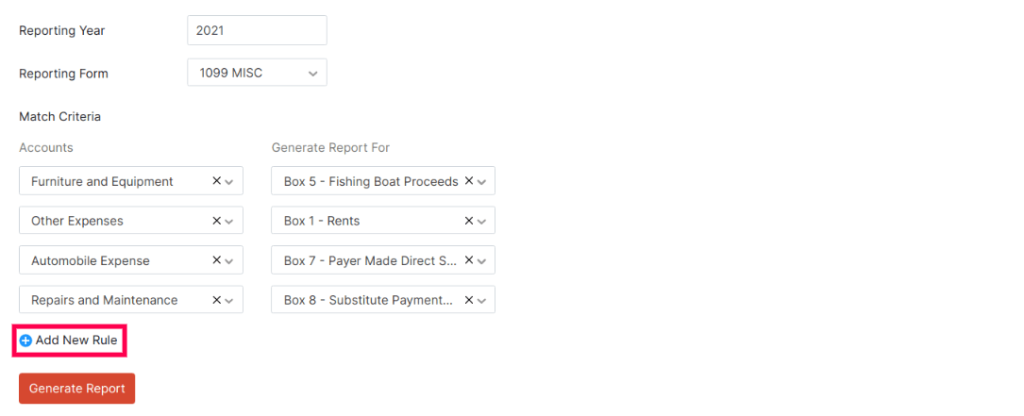 In the Match Criteria field, choose an account from the Expense Accounts drop down field and match that expense account with the correct box in the Report For drop down field.