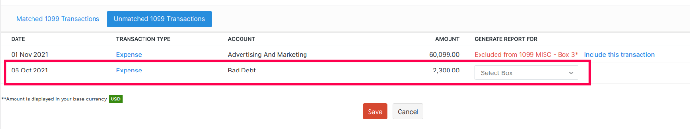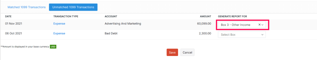 In the Unmatched 1099 Transactions tab, you can see the transaction you excluded. In this tab you can also see those transactions which fall under 1099 payments, but the account type of that specific transaction hasn’t been matched with a specific box. In other words if you haven’t set a rule to match that particular account with any box, those transactions will be found in the Unmatched 1099 Transactions tab. To include the unmatched transaction for which there are no rules set, click on the Select Box drop down field and choose the appropriate Box. Click Save. This will automatically move that transaction to the Matched 1099 Transactions tab.