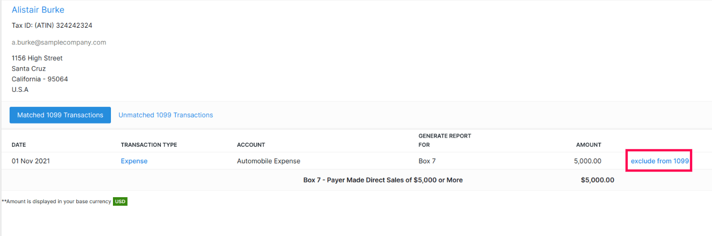 If you wish to exclude a transaction of a certain vendor from the 1099 report or if you have entered a certain account type in the wrong box, click on the particular vendor. On the transaction line which you want to exclude or edit, click on exclude from 1099 and confirm that you want to exclude the transaction. This will automatically remove the transaction from the Matched 1099 Transactions tab and transfer the transactions to Unmatched 1099 Transactions tab.
