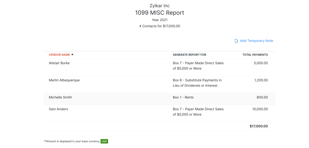 Once you set up rules, you can click Generate Report button. This will generate a report for those transactions with your contacts for whom you chose to track 1099 payments, for the selected year.
