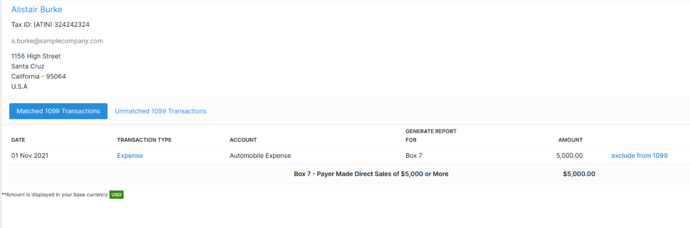 To view all the 1099 payments made to a particular vendor, click on the vendor’s name and the vendor information screen will appear, as shown in the screen below. As you can see, the contact information and tax number of that particular vendor is displayed on the top left hand side corner of the screen. Right below that, the details of 1099 transactions which are matched are displayed in the Matched 1099 Transactions tab.