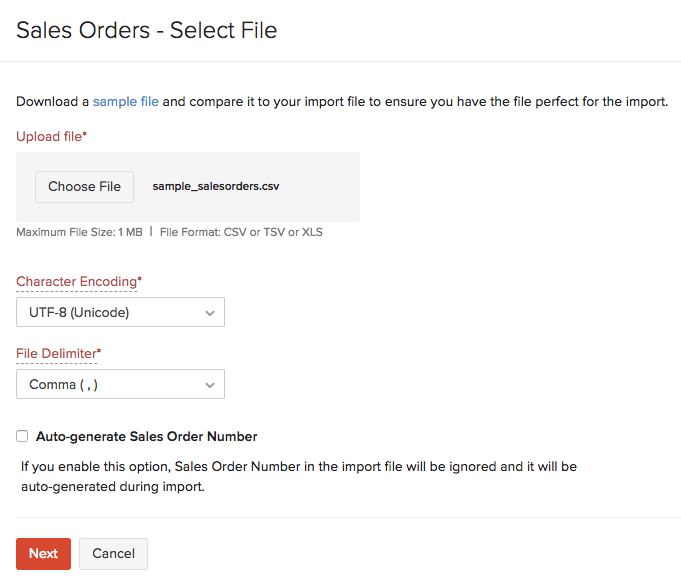 - If you want your sales order number in the imported file to be auto-generated, mark the box Auto-generate Sales Order Number.