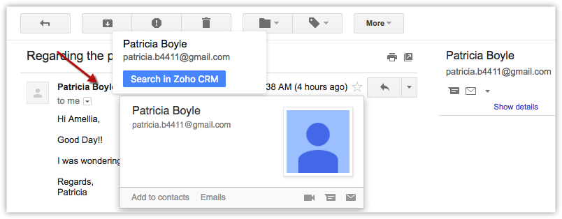 If the contact in the email is added as a lead or contact to your Zoho CRM account, the details will be available in the Extension.