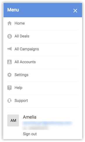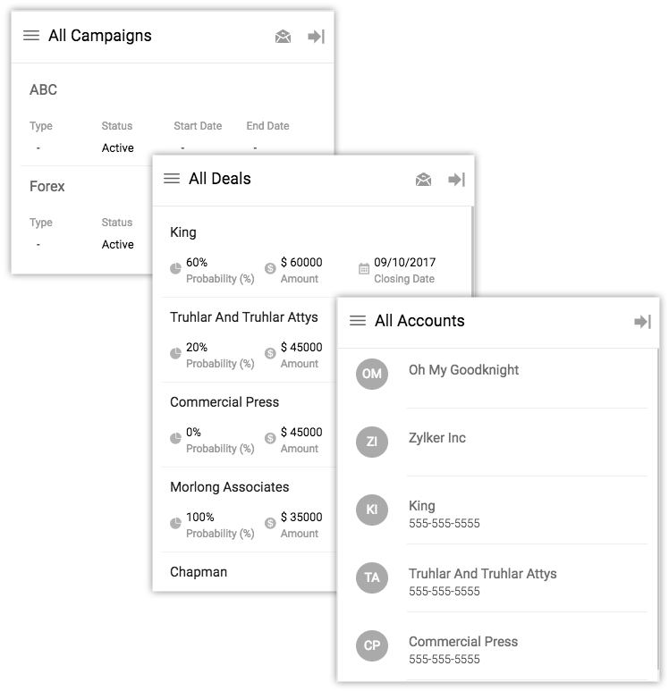 Additionally, the Chrome extension’s Menu provides you options to view and access the deals, campaigns and accounts available in your Zoho CRM account.