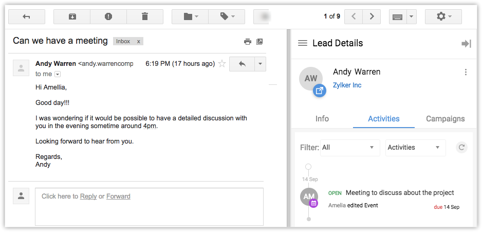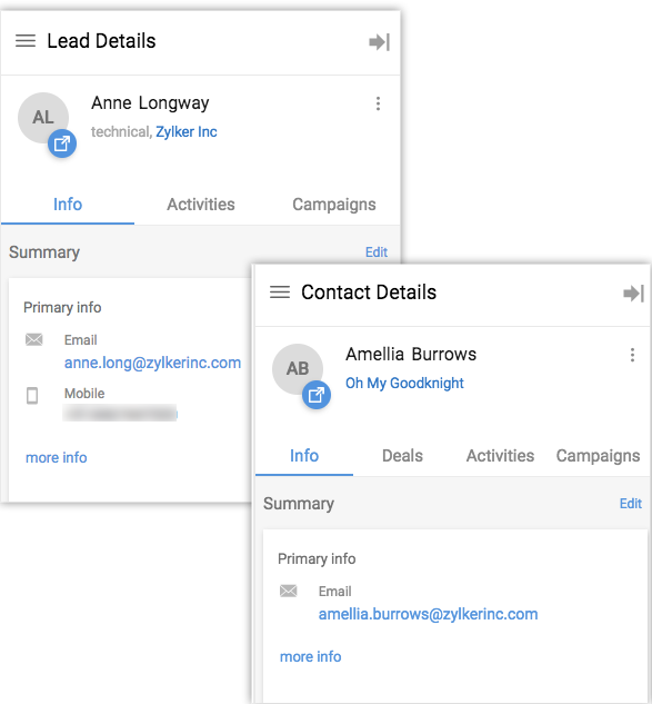 Details like primary information (email, organization, contact number), activities (tasks, calls, events) and campaigns can be viewed in your Gmail account. To view lead or contact details –
