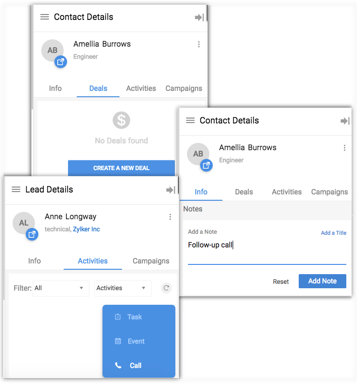Once the leads and contacts are added, there might be several information associated with them that need to be updated. Extension addresses this by allowing you to add notes or activities like tasks, calls and events directly from Gmail. For instance, you receive an email from a lead requesting to schedule a meeting, you can add an event right away from the extension using the Add Event option.