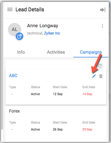 • Campaigns – View the campaigns assigned through your Zoho CRM account, you also edit the campaign details.