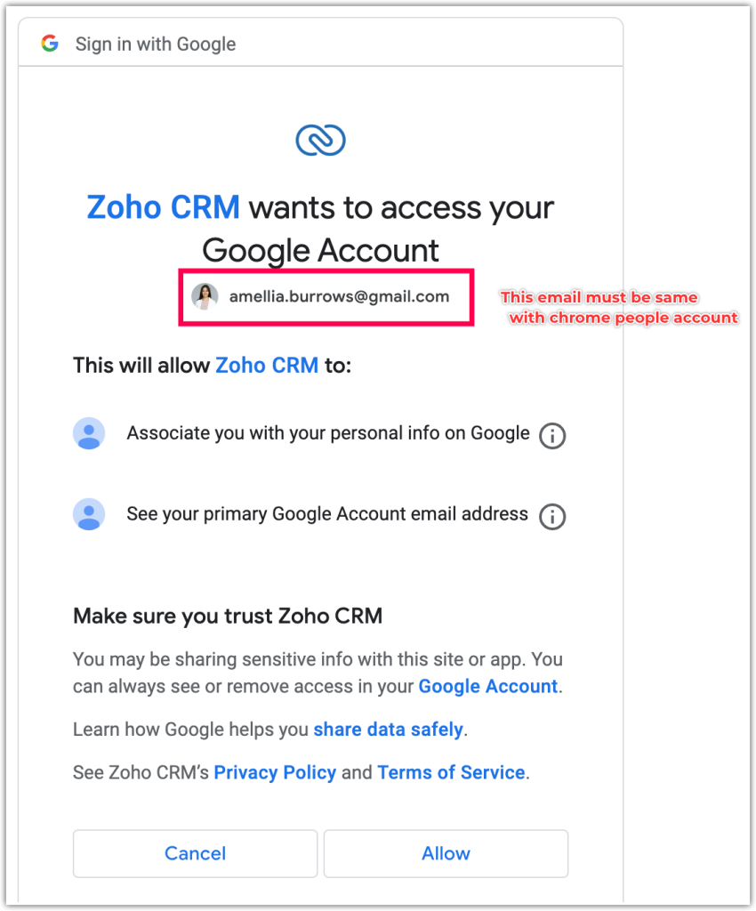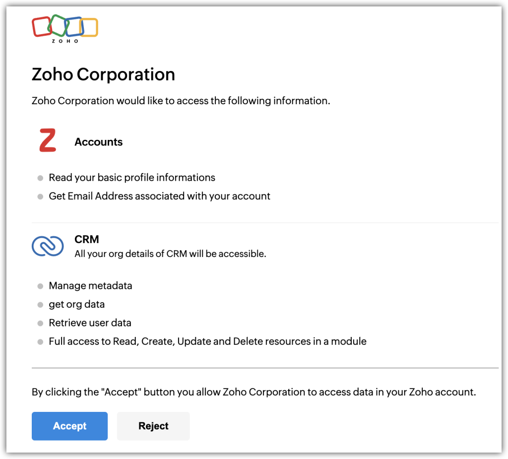 2. Click Accept to grant permission to Zoho CRM for Gmail. This will let you access                   your account.