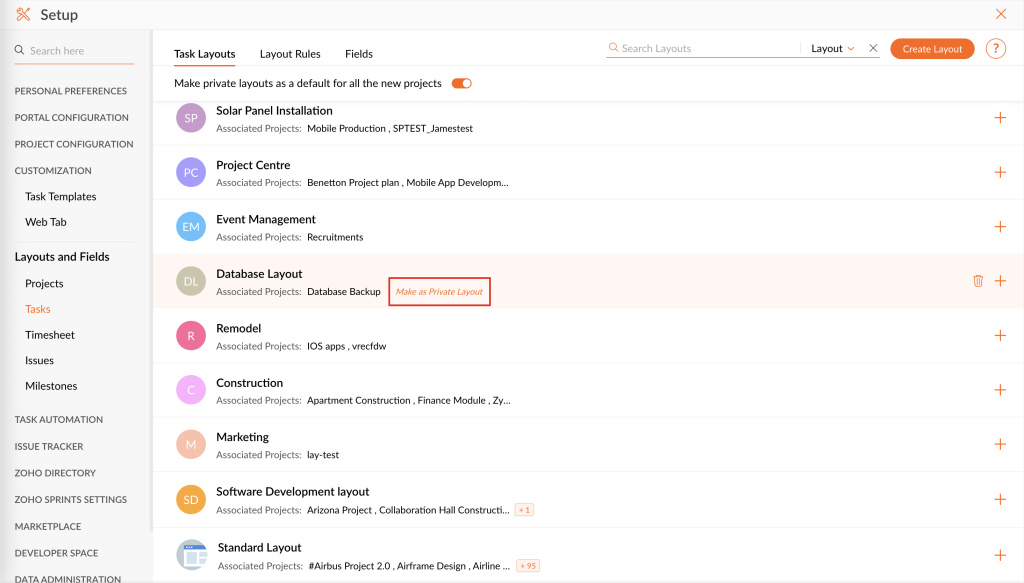 How to Make an Existing Layout as Private in Zoho Projects Users can change an existing layout as private from the Task Layout list view. Note: This option is only available for layouts with one project linked with them. Resolution Hover over a layout from the list view.Click Make as Private Layout. Private layouts can be viewed at the end of the list after refreshing the page. Zoho Projects Request Support