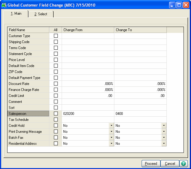 How to Reassign a Salesperson for a Group of Customers in Sage 100 The steps to reassign a salesperson are very simple:Log into Sage 100 Go to Accounts Receivable module \ Accounts Receivable Utilities \ Global Customer Field Change.On the Global Customer Field Change screen, enter the Old Salesperson code in Change From and enter the New Salesperson code In Change To.Click the Select tab to select the range of customers to which the change will be applied. SupportIf necessary, seek the assistance of Acute Data Systems to help provide assistance with this process. Sage 100 Request Support