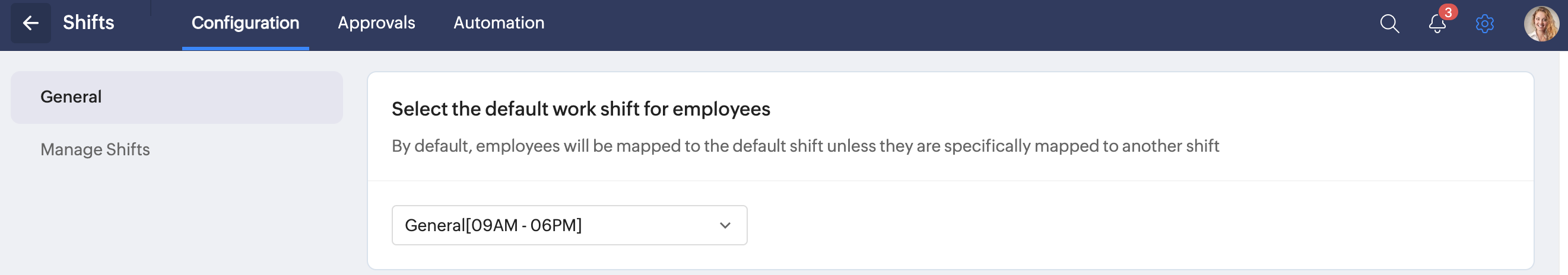 To select the default work shift, navigate to Settings > Shifts > Configuration > General and use the drop-down to select the default work shift.