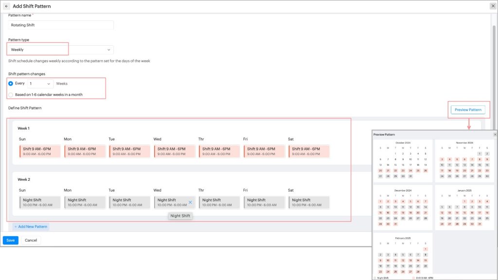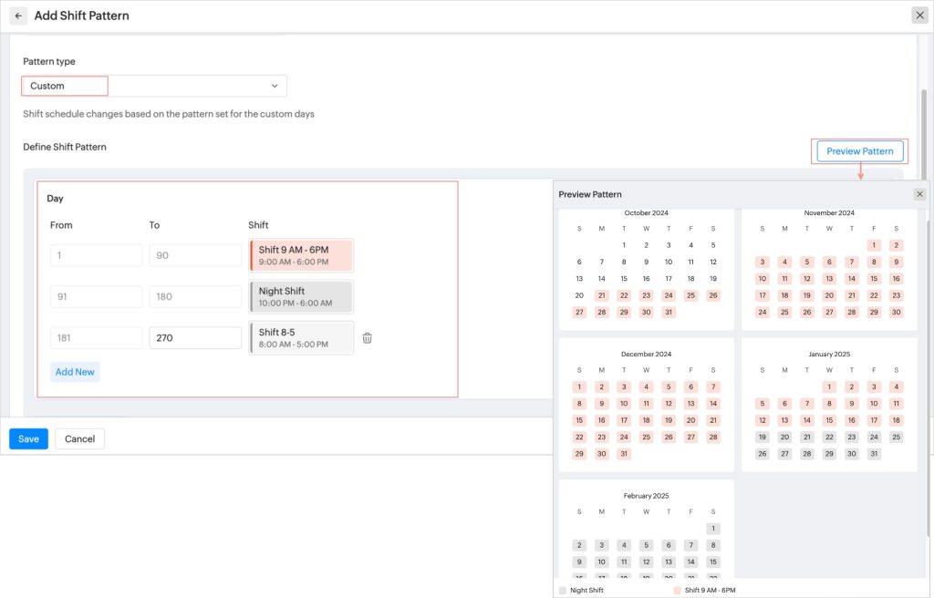 b. Click Preview Pattern to view the preview of the defined custom shift pattern and its repetition sequence. You can only view the pattern preview for the next five months.