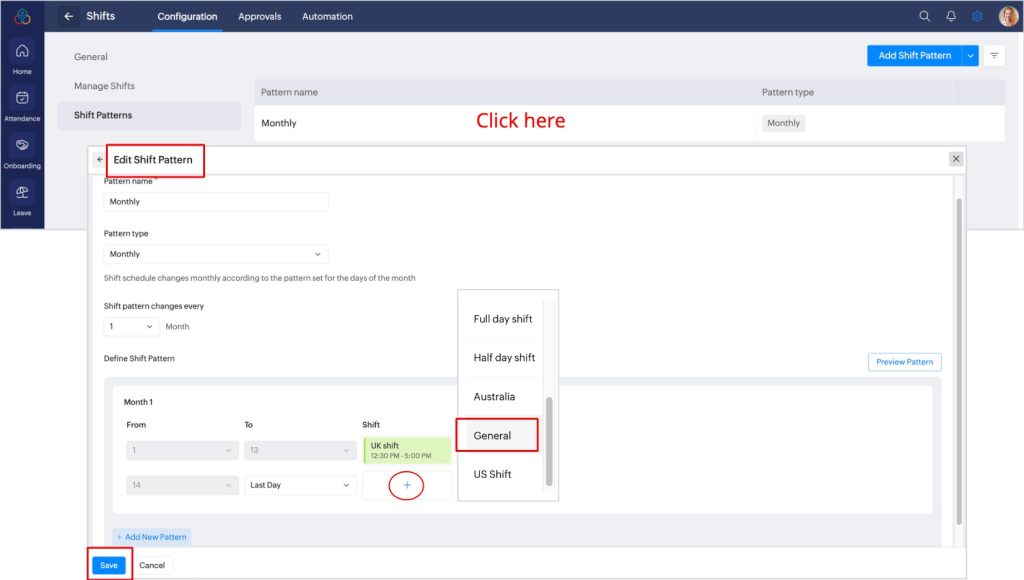 - In the Define Shift Pattern, click on the (+) icon and select the required shift and click Save.