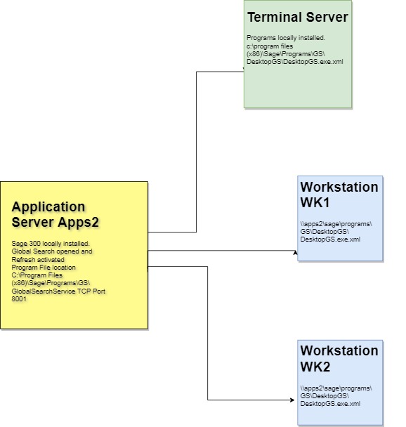Global search is installed on a Sage 300 applications server, this installation is comprised of a service (GlobalSearchService), and a data index location (\GS\solr-7.2.1\sage300\<Database ID>). Searches are made available to client stations through a TCP port 8001, desktops interact with this port and make requests.