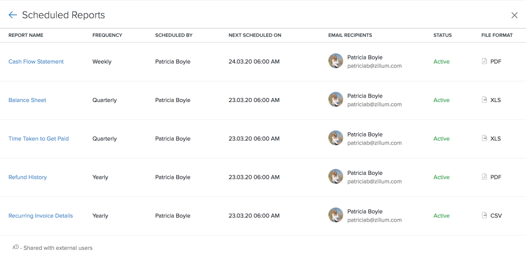 Zoho Books lists all the reports you’ve scheduled, for your reference. You can keep track and view the details of them in our dedicated Scheduled Reports page.