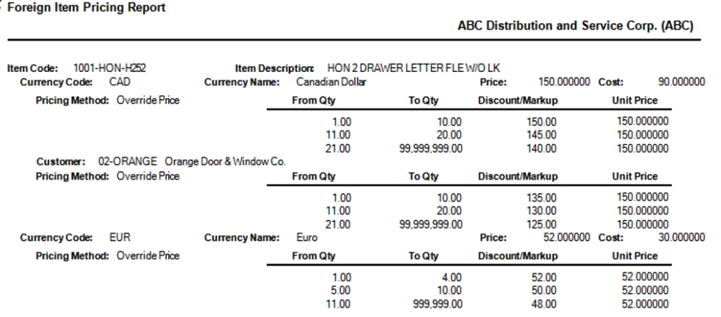 Add foreign prices by item or customer and generate comprehensive reports of price levels by currency.