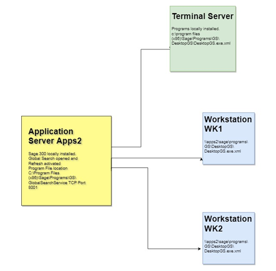 Global search is installed on a Sage 300 applications server, this installation is comprised of a service (GlobalSearchService), and a data index location (\GS\solr-7.2.1\sage300\<Database ID>).  Searches are made available to client stations through a TCP port 8001, desktops interact with this port and make requests.