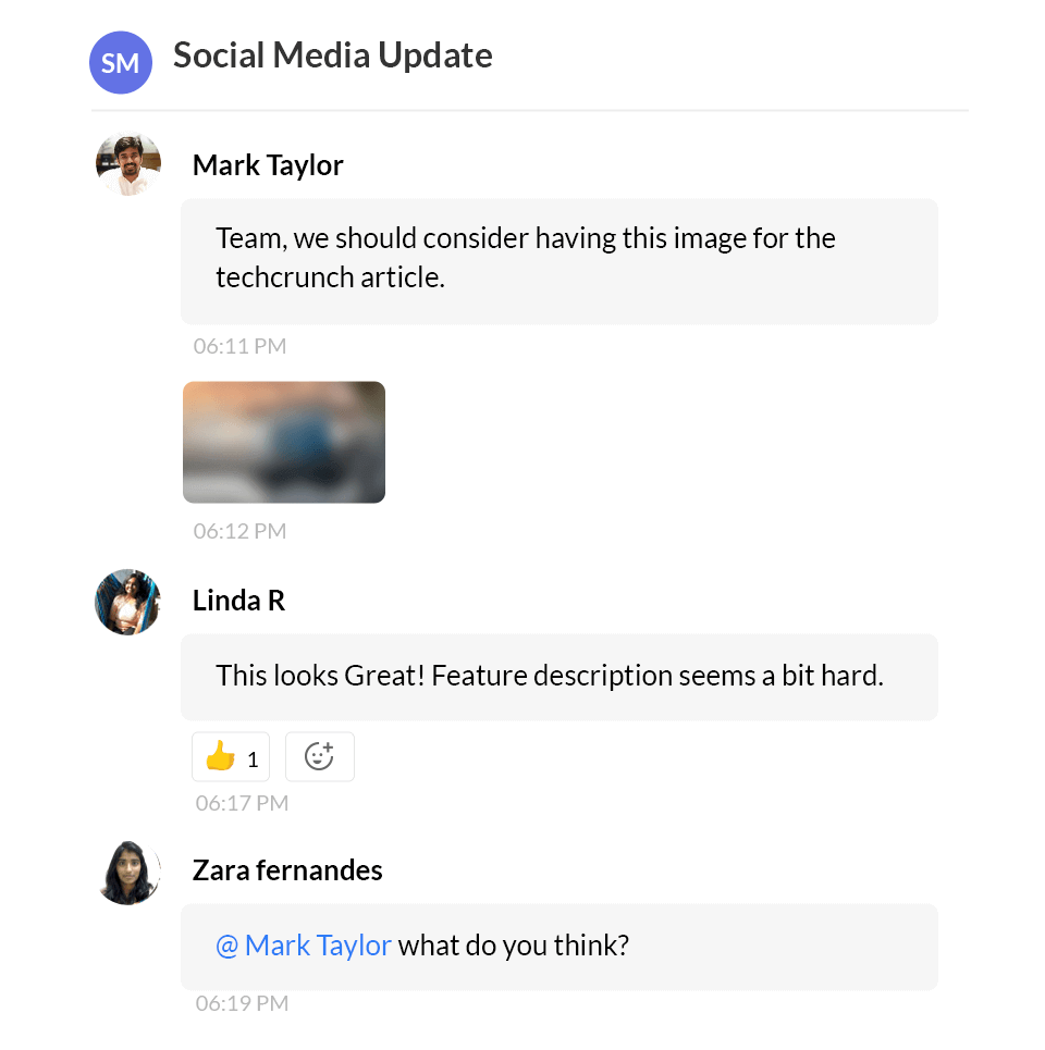 Zoho Projects sends you feedback instantly and within a feedback a you can attach multiple files and tag multiple people.