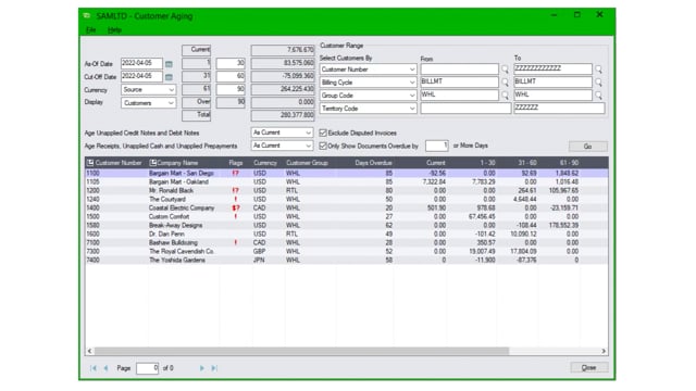 CRM and Collection’s customer aging screen shows you which accounts are overdue and require attention.