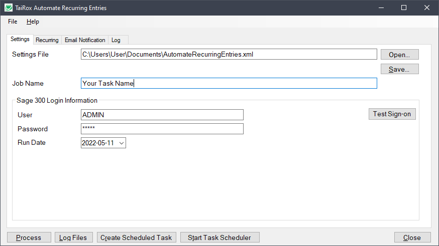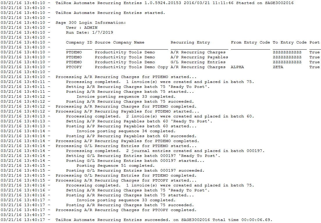 Automate Recurring Entries automates Sage 300 G/L Recurring Entries, A/R Recurring Charges and A/P Recurring Payables operations for any number of companies in a single operation. Any number of Sage 300 G/L, A/R and A/P recurring entry operations will be performed in each company, as set up using the standard Sage 300 application. The resulting batches can optionally be posted. The program is designed to run as an unattended Windows Scheduled Task, as well as from a user interface.