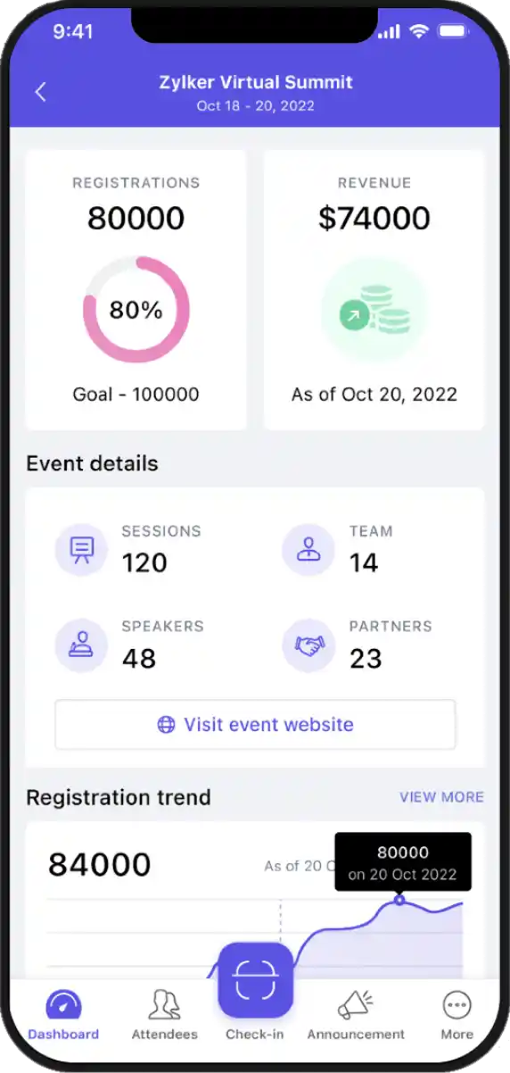 From a fully-customizable event website to email campaigns, from customizable social banners to affiliate marketing, Zoho Backstage helps you get the word out about your event in multiple ways so you can reach a wider audience.