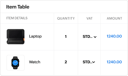Learn stock availability as you raise invoices or other transactions, and see Zoho Books populate the relevant prices, taxes, and other details, saving valuable time. Easily add items in bulk, too.