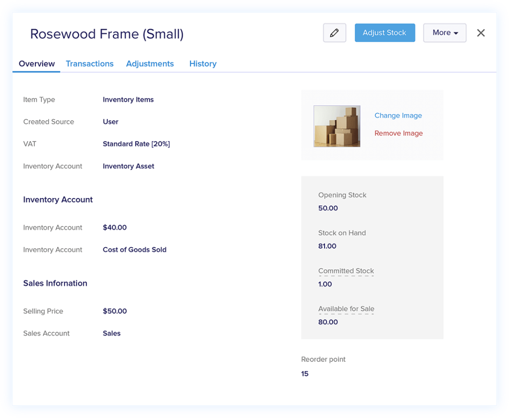 Organize your purchase and sale items with Zoho Books, complete with details like SKUs, purchase and sales costs and taxes, preferred vendor, description, and product image.