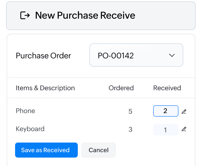 Record partial receipts against your purchase orders when vendors deliver items in batches, maintaining accurate stock levels and ensuring smooth delivery tracking.