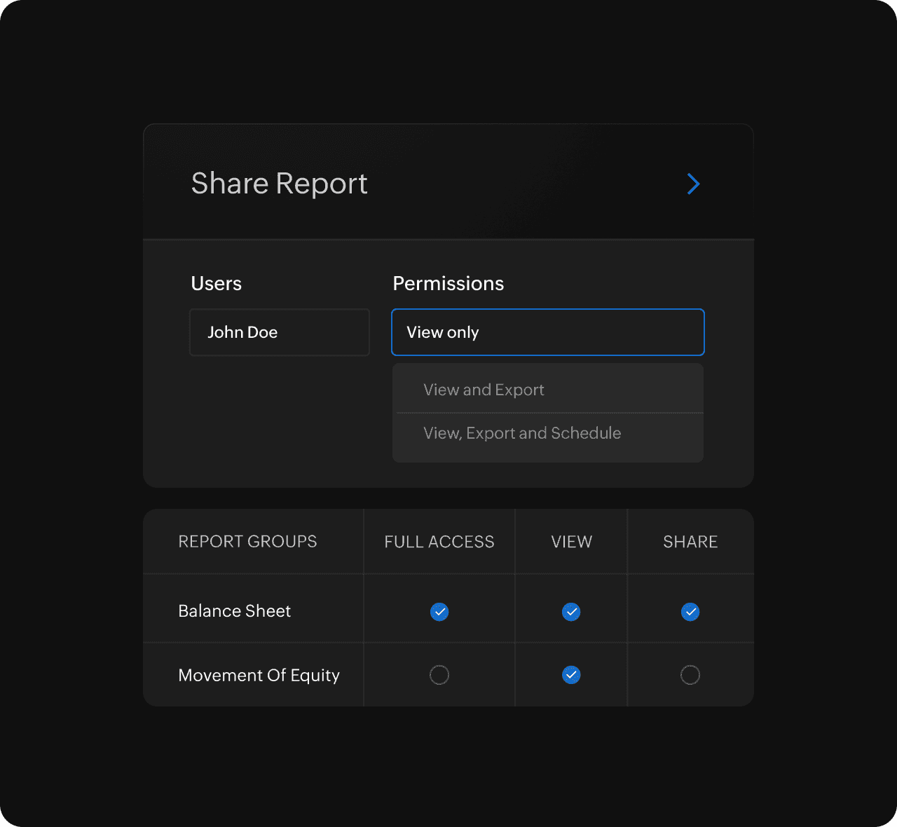 Grant secure access to Zoho Books reports by defining custom roles to share entire modules or specific reports. You may even invite investors, leadership, and other key stakeholders to view relevant reports directly rather than emailing them.