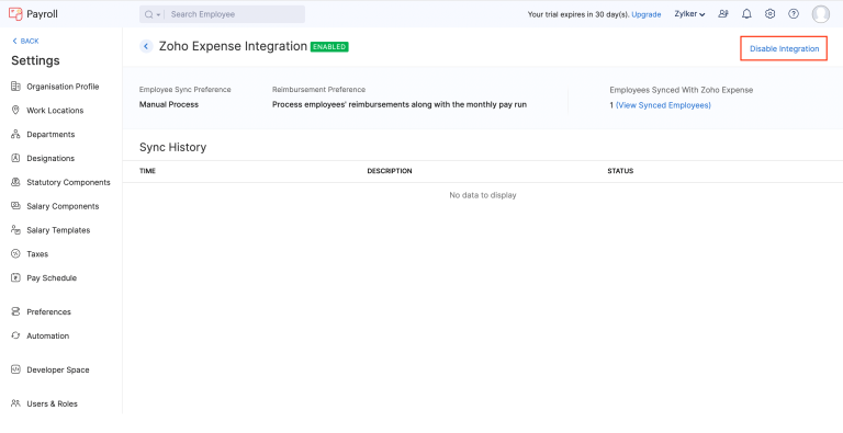 Once you disable the integration, the reimbursement details will not be sent to Zoho Payroll. However, the users who were synced between the apps can use both the apps and their data will not be deleted. To disable the integration: