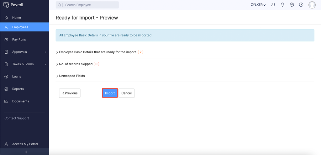 Once you’ve mapped the fields, import the users to Zoho Payroll. Here’s how: