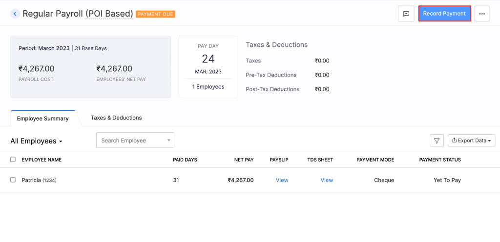 11. Once that is done, you can pay the employees and record it in Zoho Payroll by clicking Record Payment at the top right corner of the page.