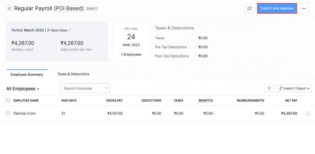 10. Review the pay run and click Submit and Approve at the top right side of the page. The pay run will be approved.