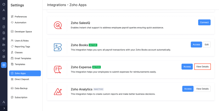 - The Zoho Payroll integration is only available in the India edition of Zoho Expense.