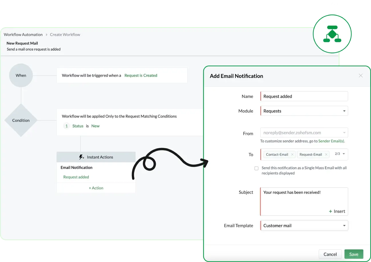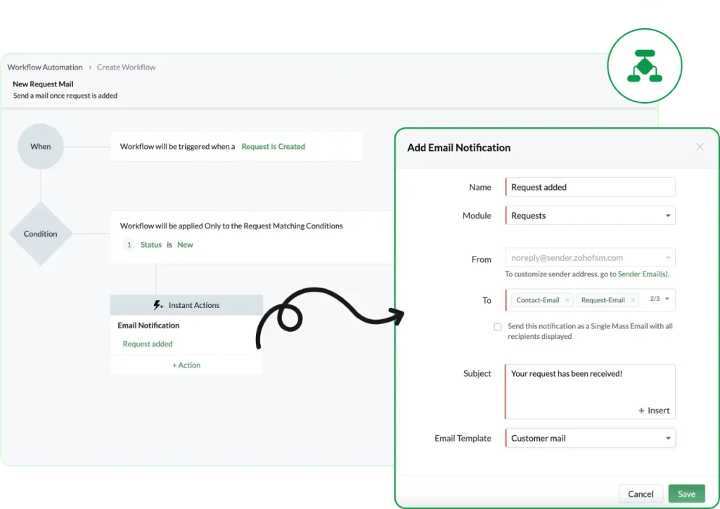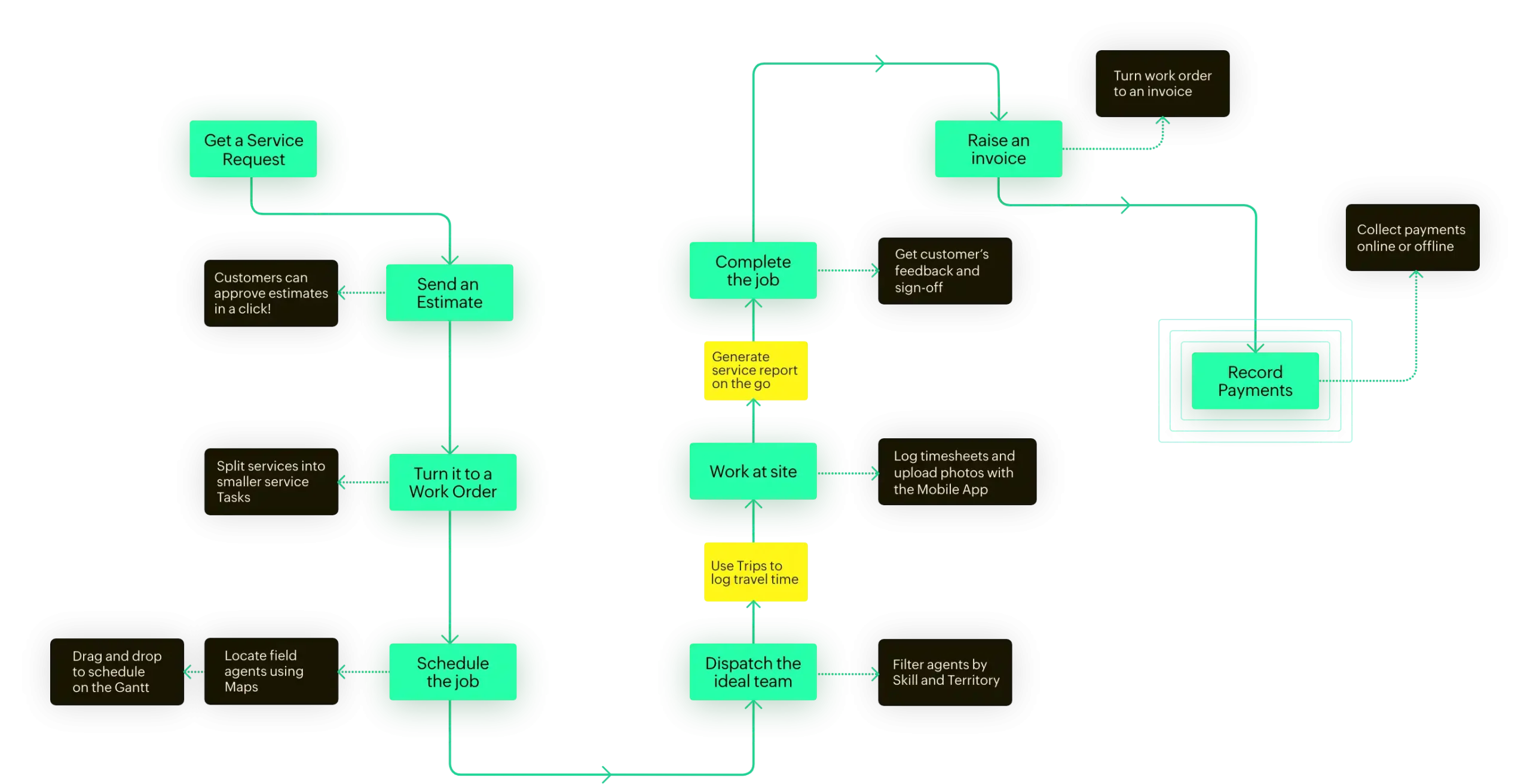 Unlock the potential of efficiency with Zoho Field Service Management (FSM)’s automation capabilities. From streamlining customer queries to optimizing inventory management, harness the power of workflow rules, field updates, webhooks, and custom functions for seamless operations and enhanced productivity.